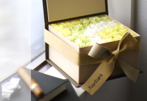 graffitoとはイタリア語で回想。 大切だった人を偲び、 想いが詰まったやさしい花を贈りませんか。 清楚なグリーンや柔らかいオフホワイトのアレンジは、 心に安らぎや温かみを与えてくれます。 グラフィートの落ち着いたカラーバリエーションと 花瓶不要の特性から、最近はペットのメモリアルの贈り物としても 多数ご利用いただいております。 また、箱とリボンのカラーはグラフィート専用のものをご用意してございます。